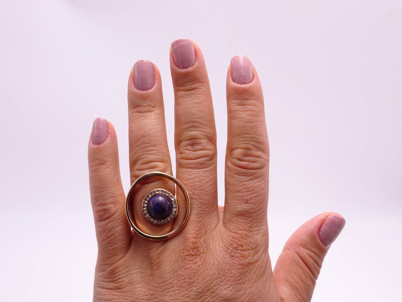 Golden ring with hand carved stabilized wood cabohcon and crystals