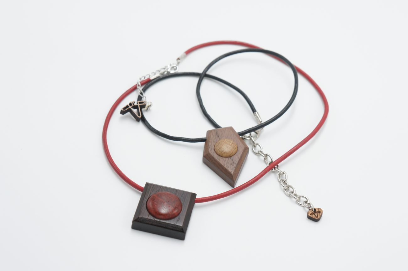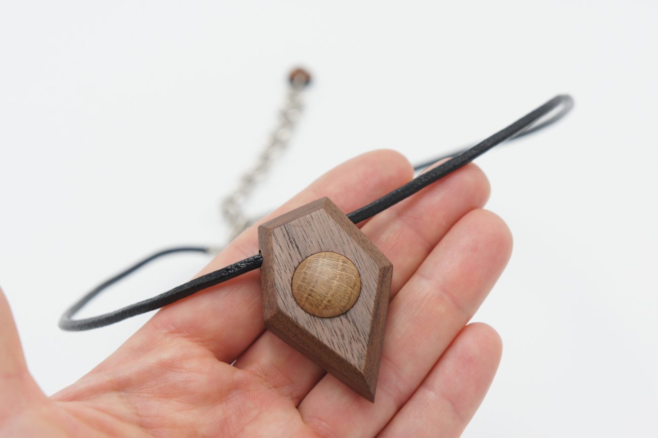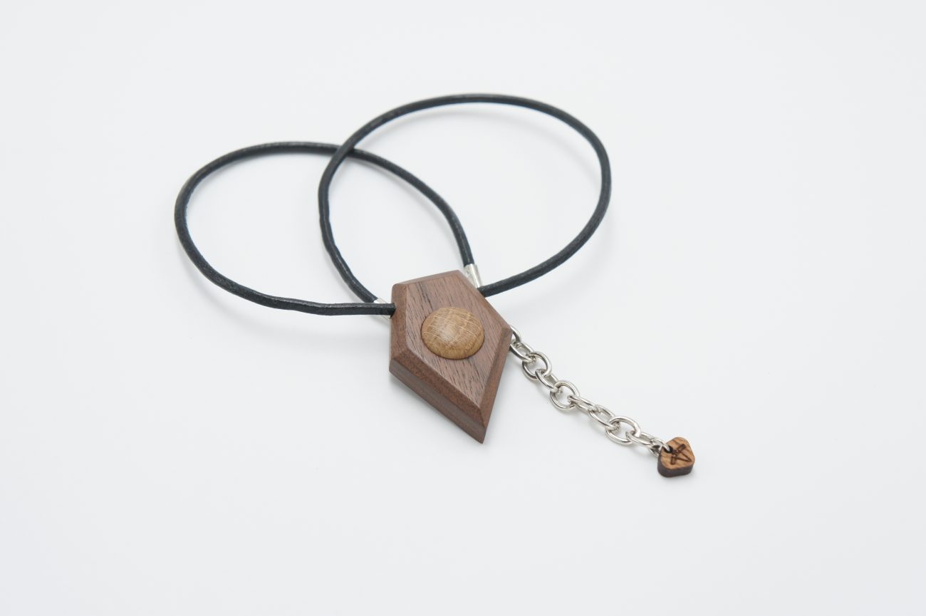 Black leather choker with hand carved walnut and oak pendant